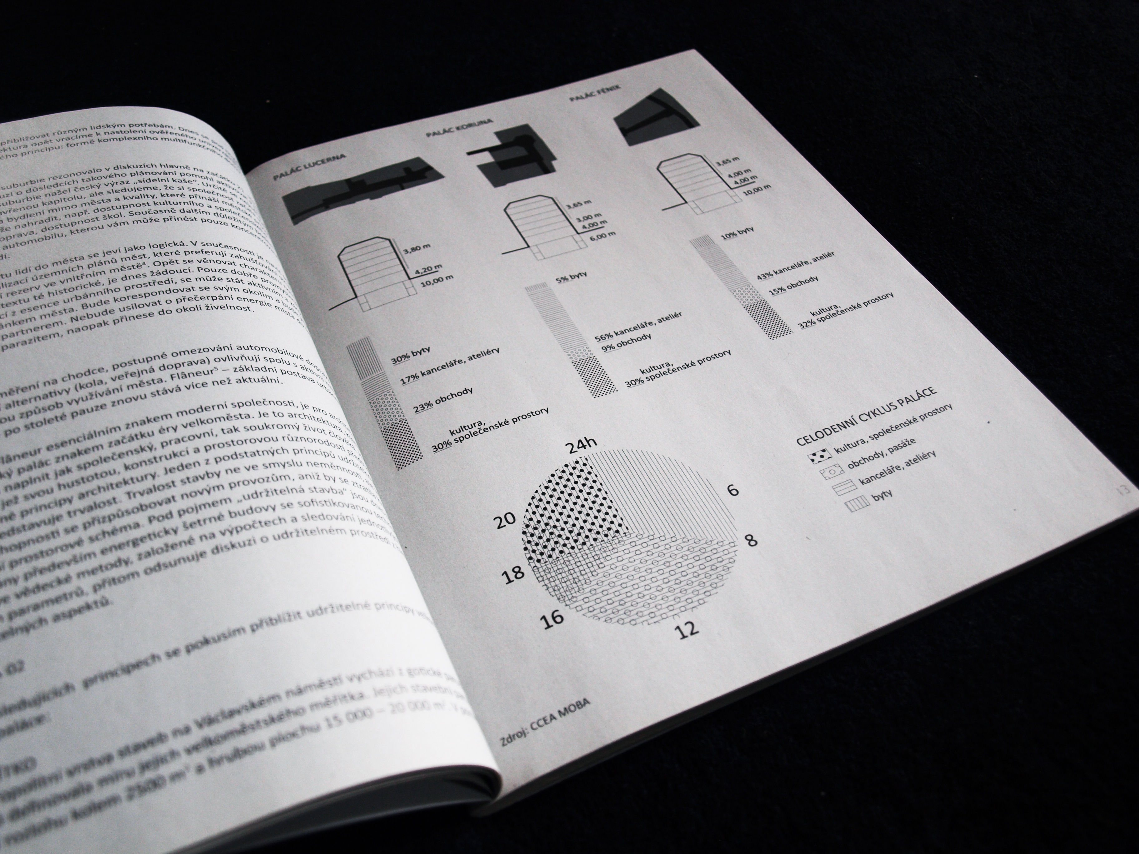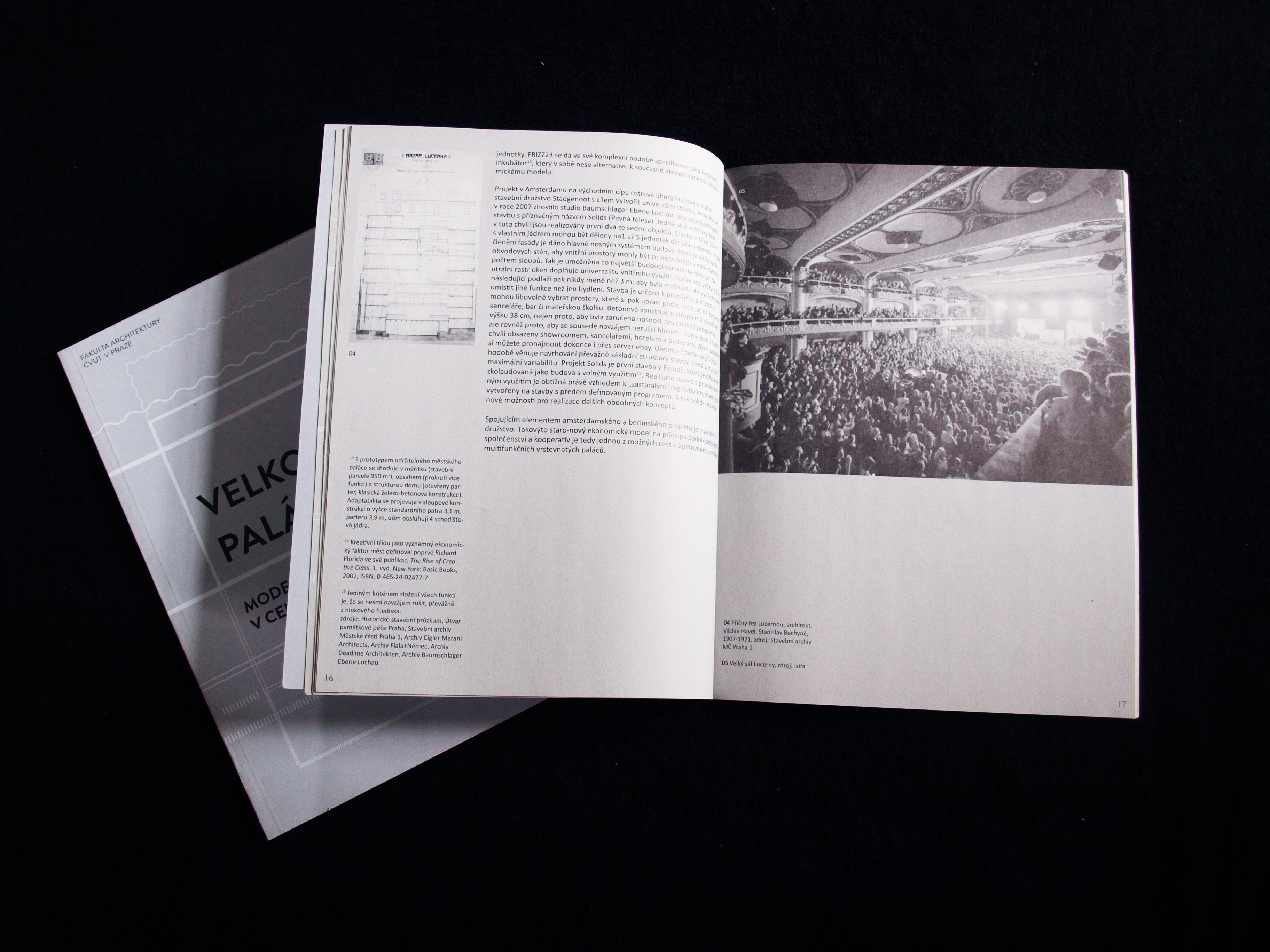 A publication devided into three parts with three different shades of grey paper to help distinguish between author's writings, interviews with architects and essays of students on the subject of 'City palaces'.
