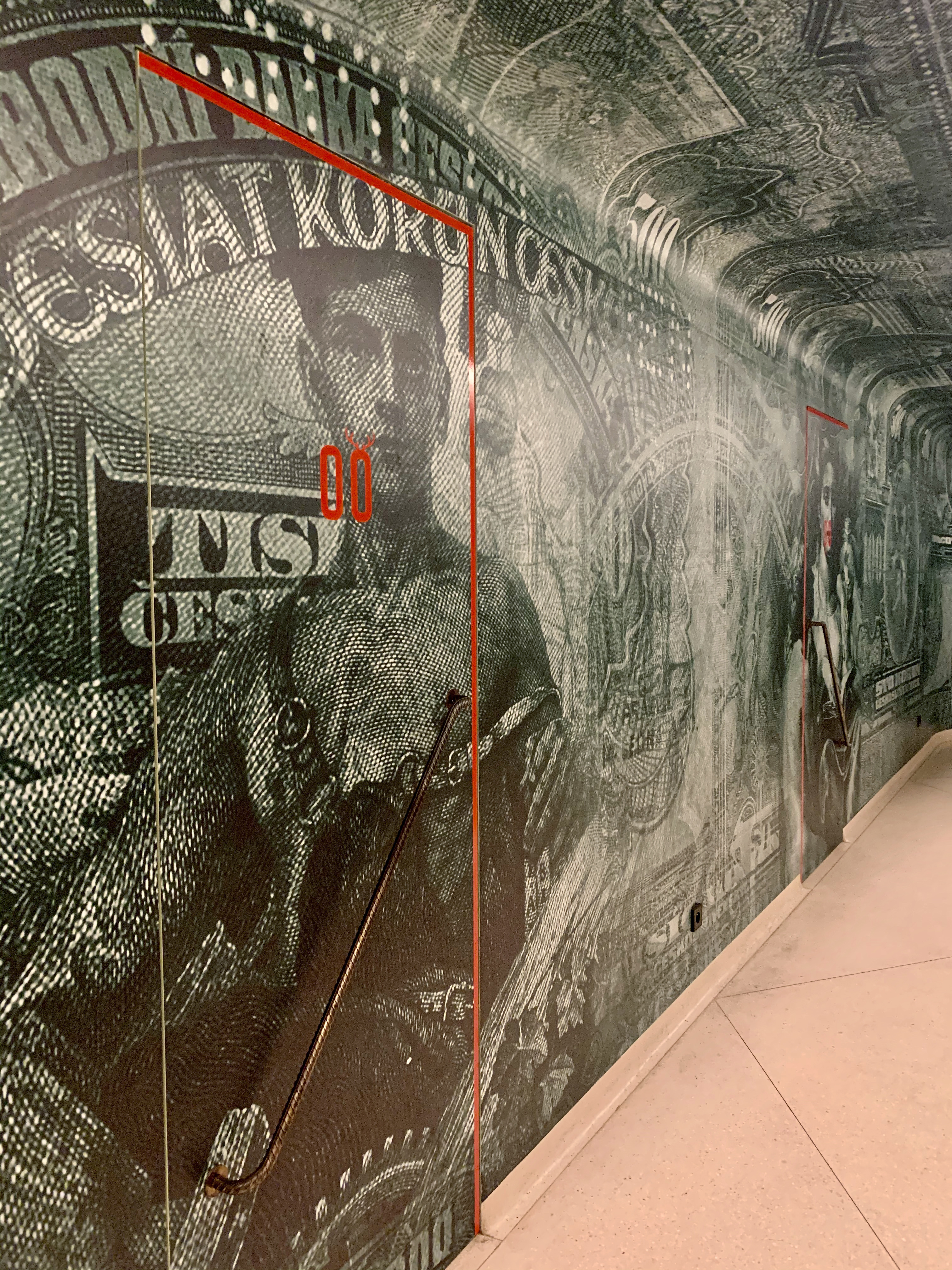 The collage has been designed so the faces from the bank notes fit the purpose of doors to the ladies & gentlemen restrooms and the cleaning storage room.